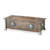 set with Ruskin ceramic roundels and with exposed rivet decoration, the hinged lid enclosing a divided interior