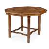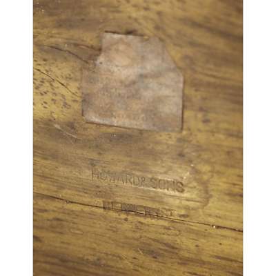 the octagonal top, parquetry inlaid, above a plain frieze on square chamfered legs linked by shaped and moulded stretchers, bears stamped maker's marks and retailer's label HOWARD & SONS/ BERNERS ST/ LONDON