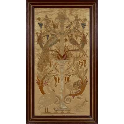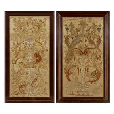 each embroidered with a central pillar enclosed by large floral and foliate arabesques and cornucopias and by an assortment of birds, animals and a winged figure, within period frames (2)
