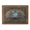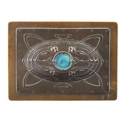 embossed with whiplash foliage and set with a Ruskin ceramic roundel, the interior with velvet lining, marked to base MCVITIE & PRICE/ LONDON & EDINBURGH