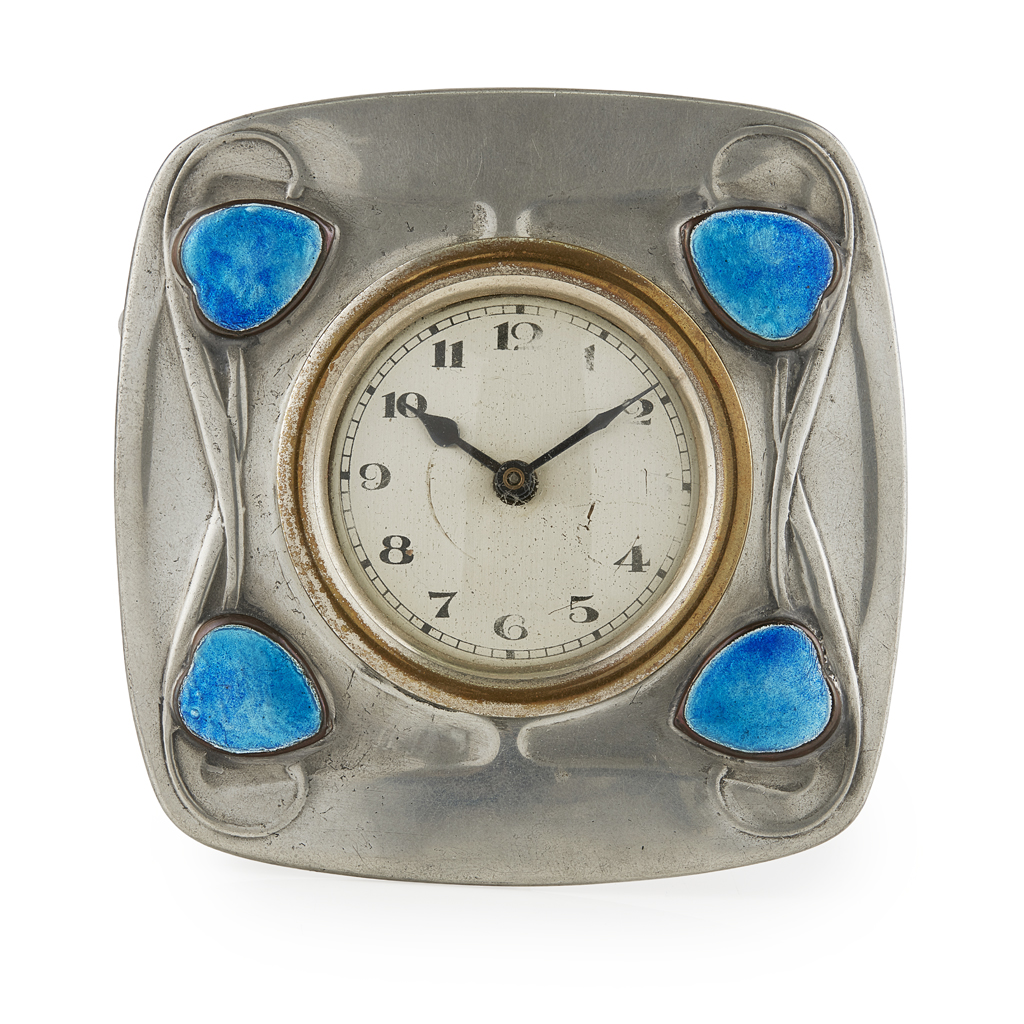 'TUDRIC' PEWTER AND ENAMEL STRUT CLOCK, CIRCA 1900
