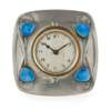 the circular dial enclosed within square case cast with whiplash foliage and set with turquoise enamels, stamped marks "TUDRIC"/ MADE IN ENGLAND