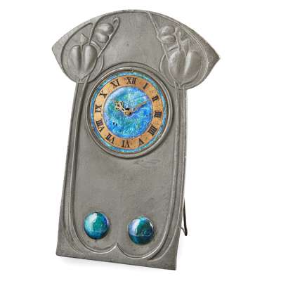 'TUDRIC' PEWTER AND ENAMEL MANTEL CLOCK, CIRCA 1900