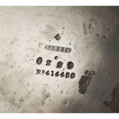 with supporting handles forming the feet, embossed with stylised honesty seed pods and stems, stamped maker's marks, TUDRIC/ 0229