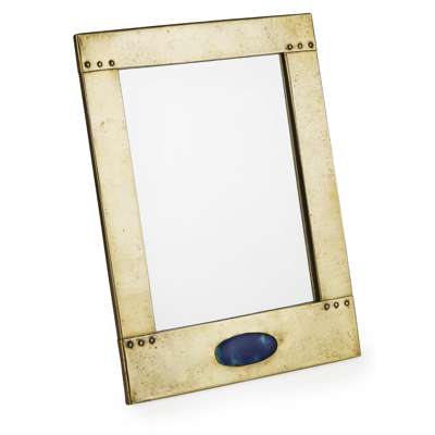 the rectangular planished frame with rivet decoration, set with an oval Ruskin cabochon