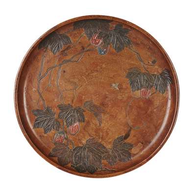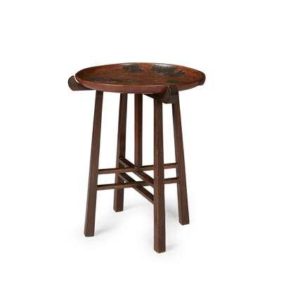 the circular carved tray top raised on folding stand, bears ivorine maker's label