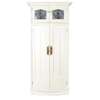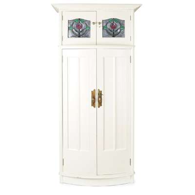 the projecting cornice above two doors panelled with stained and leaded glass on a pewter ground and depicting roses, above two further panelled doors on a plinth, adapted