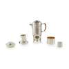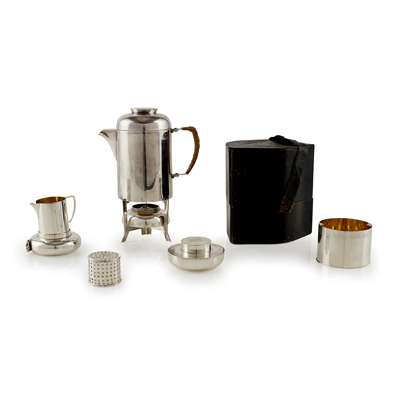 the fitted leather case enclosing a SPIRIT KETTLE, BURNER & STAND, 20.5cm high; TEA INFUSER, 3.2cm high; MILK JUG & WARMER, 7.5cm high; SUGAR CONTAINER, 7.5cm diameter; and a DRINKING CUP, 7cm diameter, stamped maker's marks to kettle H&H/ W.T/ 2844