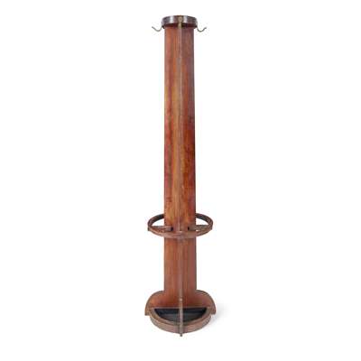 with tapering cruciform frame, with coat hooks above a ring support for sticks and with circular base enclosing drip trays