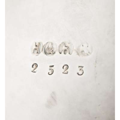 on four tapering splayed supports with twin circular dishes and central ring handle, stamped marks H&H/ 2523