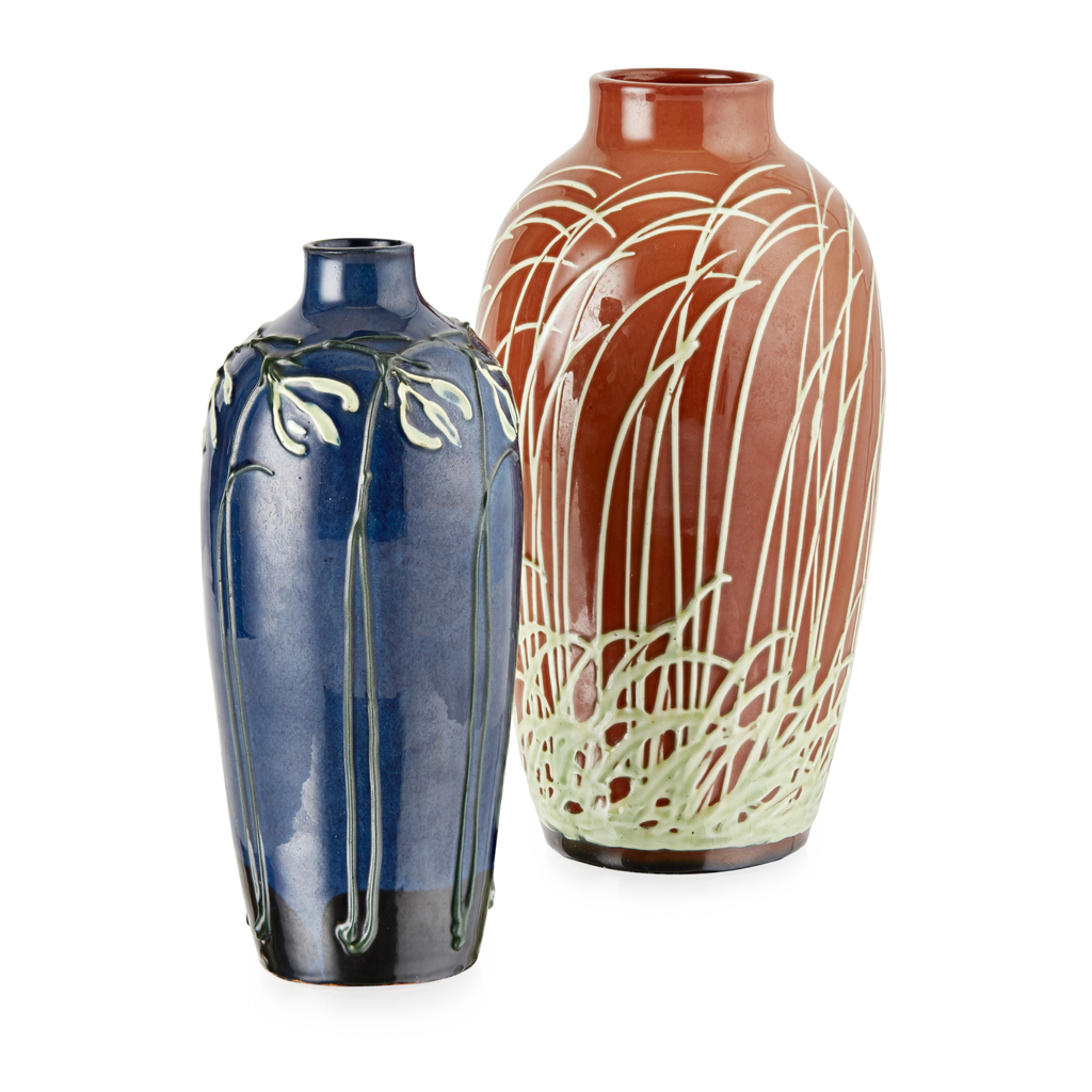 each of shouldered tapering form, one depicting grasses on a rust coloured ground, impressed makers mark, 22cm high; the other depicting green stems with cream flowers, stamped with makers mark and indistinct incised markings, 19.5cm high (2)