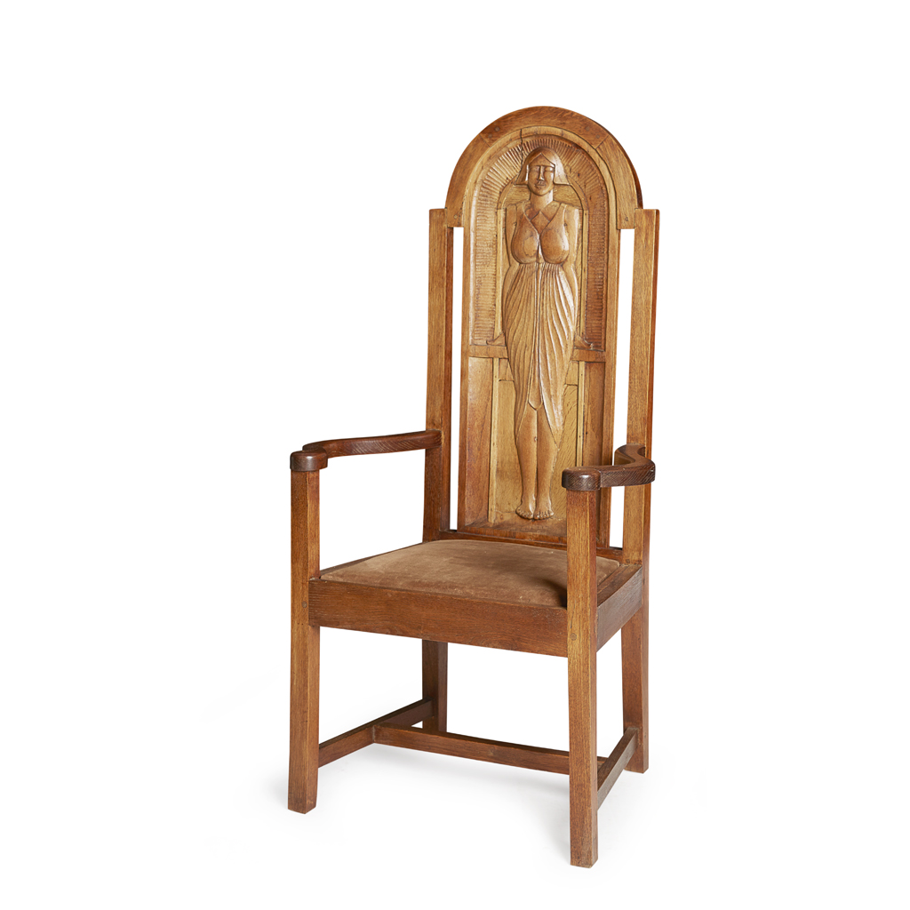 the tall back carved with a Jugendstil maiden above curved open arms on a solid seat and square section legs linked by stretchers