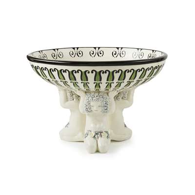 the wide circular bowl stencil-decorated with bands of stylised buds and held up by three kneeling putti with floral garlands, incised mark '7377', impressed mark '43/11'