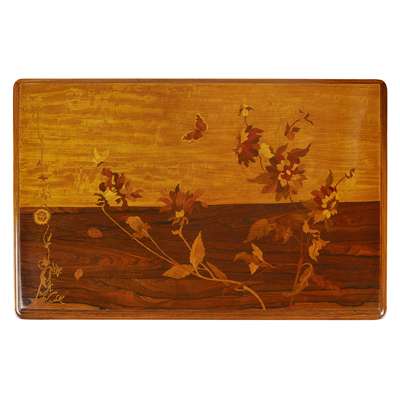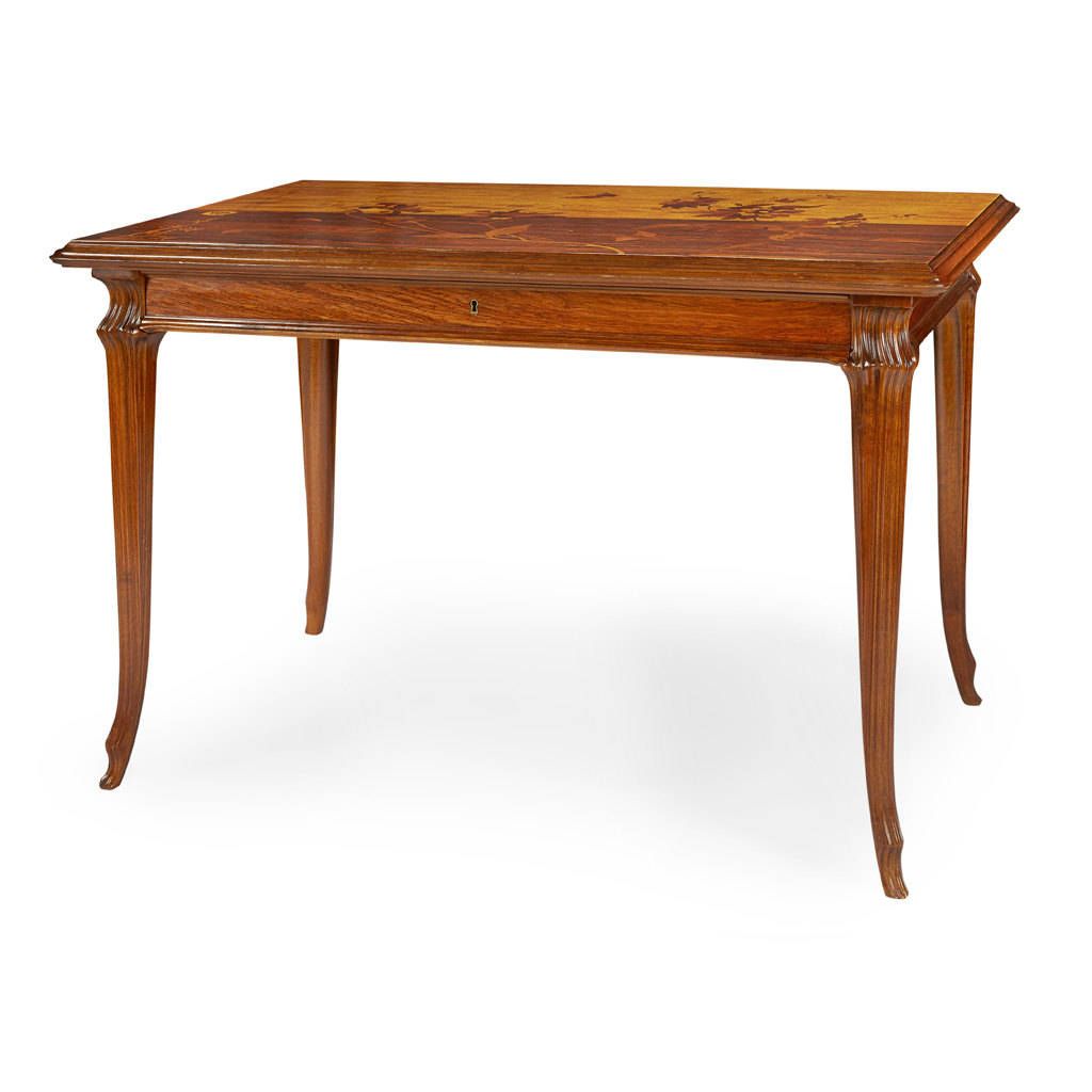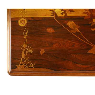 Note: Best known for his skill as a glass-maker, from 1889 Galle was also a successful furniture designer. He founded the School of Nancy, a group of designers who produced most of the best Art Nouveau glass and furniture in France from the 1880s until his death in 1904. This fine bureau plat with exuberant marquetry inlay demonstrates a playful juxtaposition between the traditional form of a mid-18th century bureau plat and the Art Nouveau, with its focus on nature and naturalistic forms.