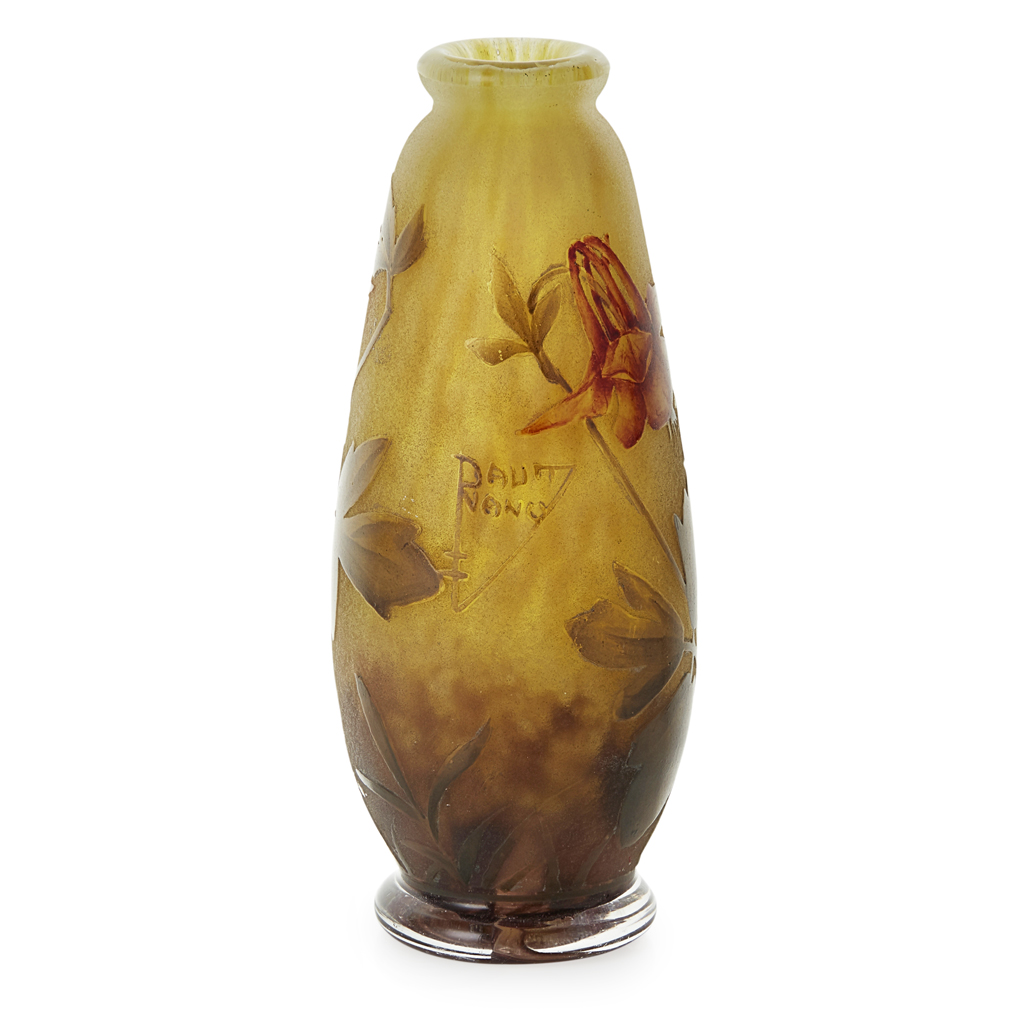 decorated with aquilegia flowers on a mottled yellow ground, signed to the body DAUM/ NANCY