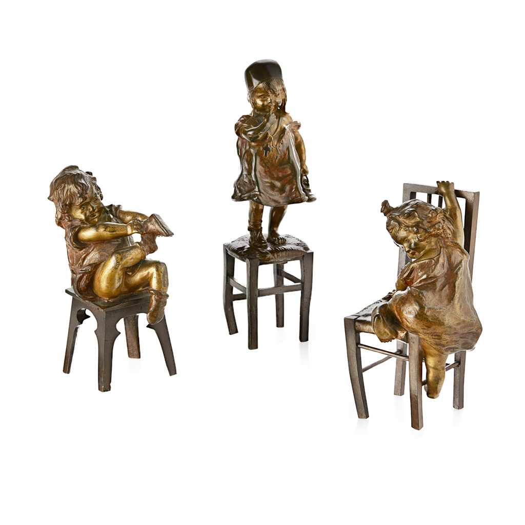 depicting a young girl standing on a stool, signed in the bronze JUAN CLARA, 21.5cm high; a young girl putting on her shoe, signed in the bronze JUAN CLARA/ GOLDSCHEIDER/ PARIS/ EL 108 1611, 15cm high; and a young girl climbing onto a chair, JUAN CLARA/ GOLDSCHEIDER/ PARIS/ EL 98 1610, 16cm high (3)
