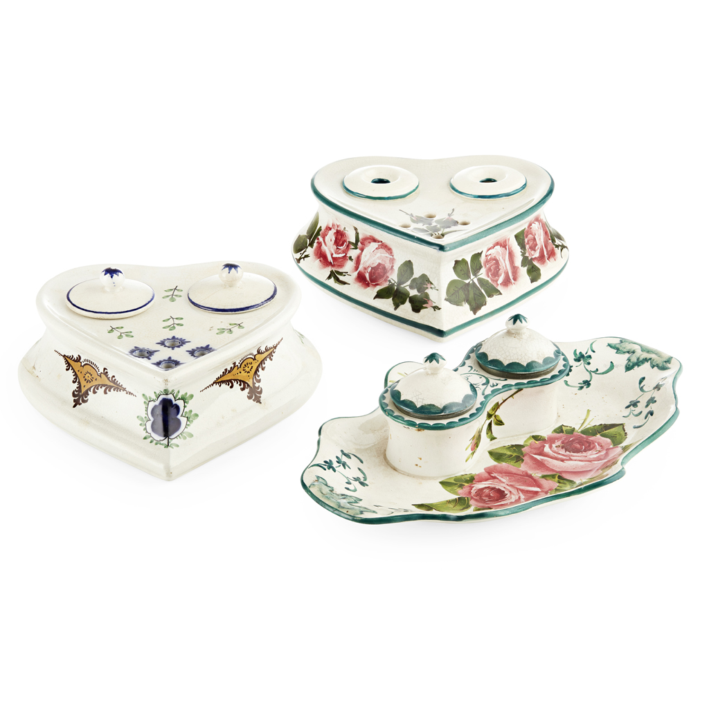 comprising a 'CABBAGE ROSES' and a 'TURKEY' PATTERN HEART-SHAPED INKSTAND, each 17cm across; also a 'CABBAGE ROSES' PRINCESS INKSTAND, 26cm across, painted and impressed maker's marks (3)