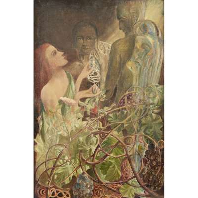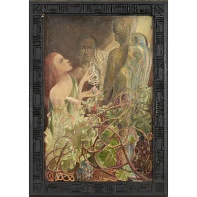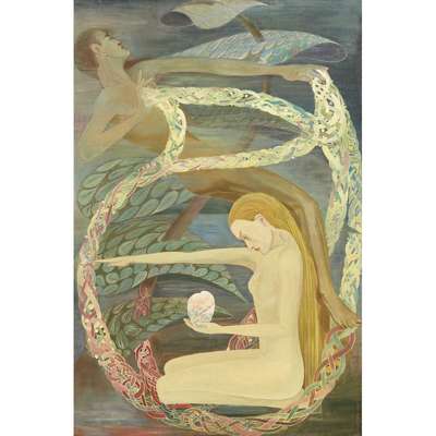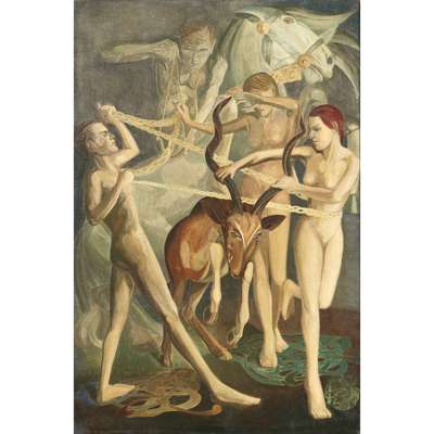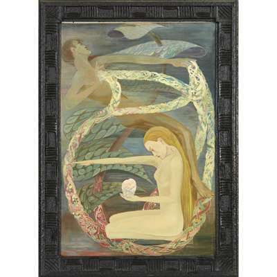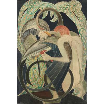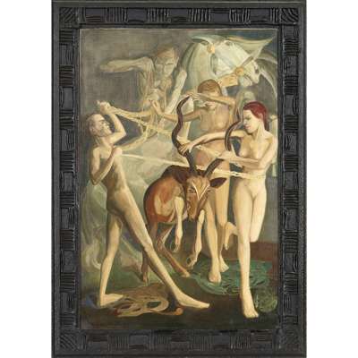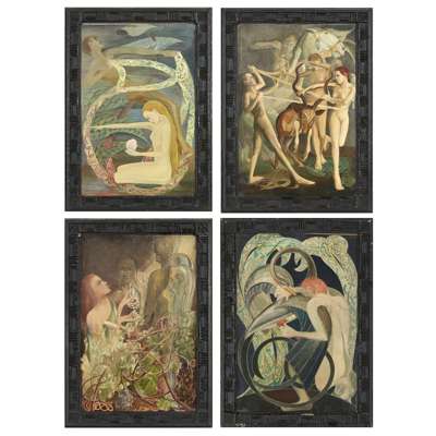 Whilst her portrait studies tend to be naturalistic, her figure compositions are Symbolist in approach and may be compared to the work of John Duncan and the artists of the Celtic Revival. The distinctive frames were made especially for this set of paintings.