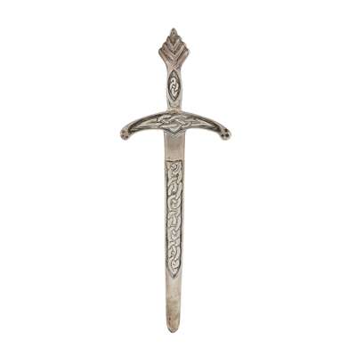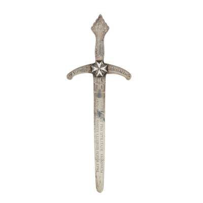 in the form of a broadsword, cast and chased with Celtic motifs, with applied Cross of St John verso and inscriptions KNIGHT HOSPITALLER OF ST JOHN OF JERUSALEM ETC.., stamped maker's marks AR/ IONA, hallmarked Chester 1908