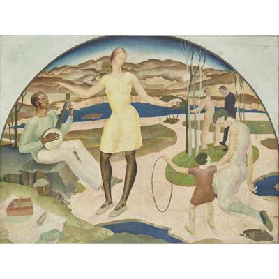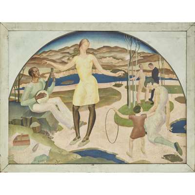 oil on board lunette, bears Glasgow School of Art label verso, indistinctly inscribed GORDON MAULE