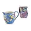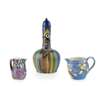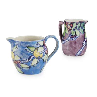 the domed cover, with painted marks EMWATT to the socle, above the elongated neck and ovoid body, painted with circles and stripes, painted marks EMW. (restorations), 30.5cm high; also TWO ELIZABETH MARY WATT PAINTED JUGS, 1930S, comprising a jug painted with berries and branches, on a purple ground, painted marks EMW./ 1936., 15cm; and an example with fruit and branches, on a blue ground, painted marks EMW., 12.5cm high (hairline to rim) (3)