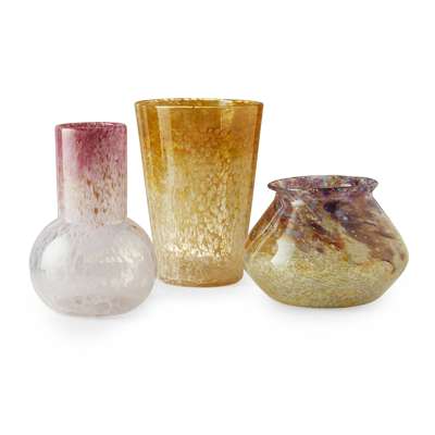 comprising a bottle vase, in pink mottled glass with aventurine inclusions, 20.5cm high; a squat vase, in yellow and opaque white glass, with purple swirls, 14cm high; and a tapered vase, in yellow mottled glass, 21.5cm high; with labels for the Parkington Collection/ 399/6/ Christie's (3)