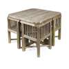 comprising four corner chairs, 65cm wide, 68cm high, 49cm deep; and a matching table, with slatted top, 95cm across, 73cm high (5)