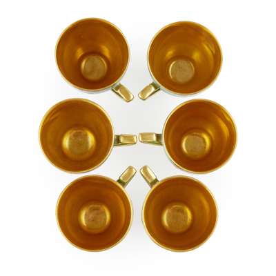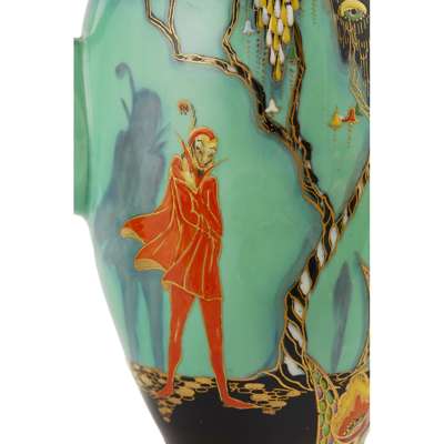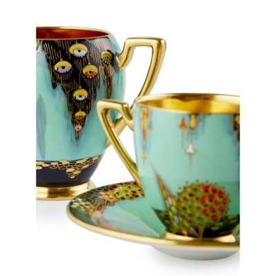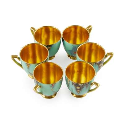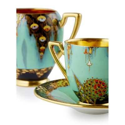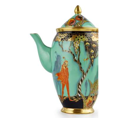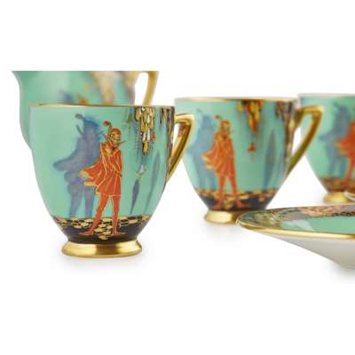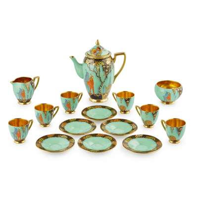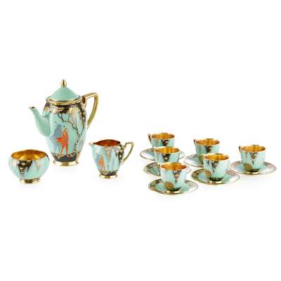 comprising a COFFEE POT & COVER, 20.5cm high; SIX CUPS & SAUCERS; SUGAR BOWL; and MILK JUG, each printed and painted in gilt and coloured enamels with a red devil in a landscape, printed and painted maker's marks (15)