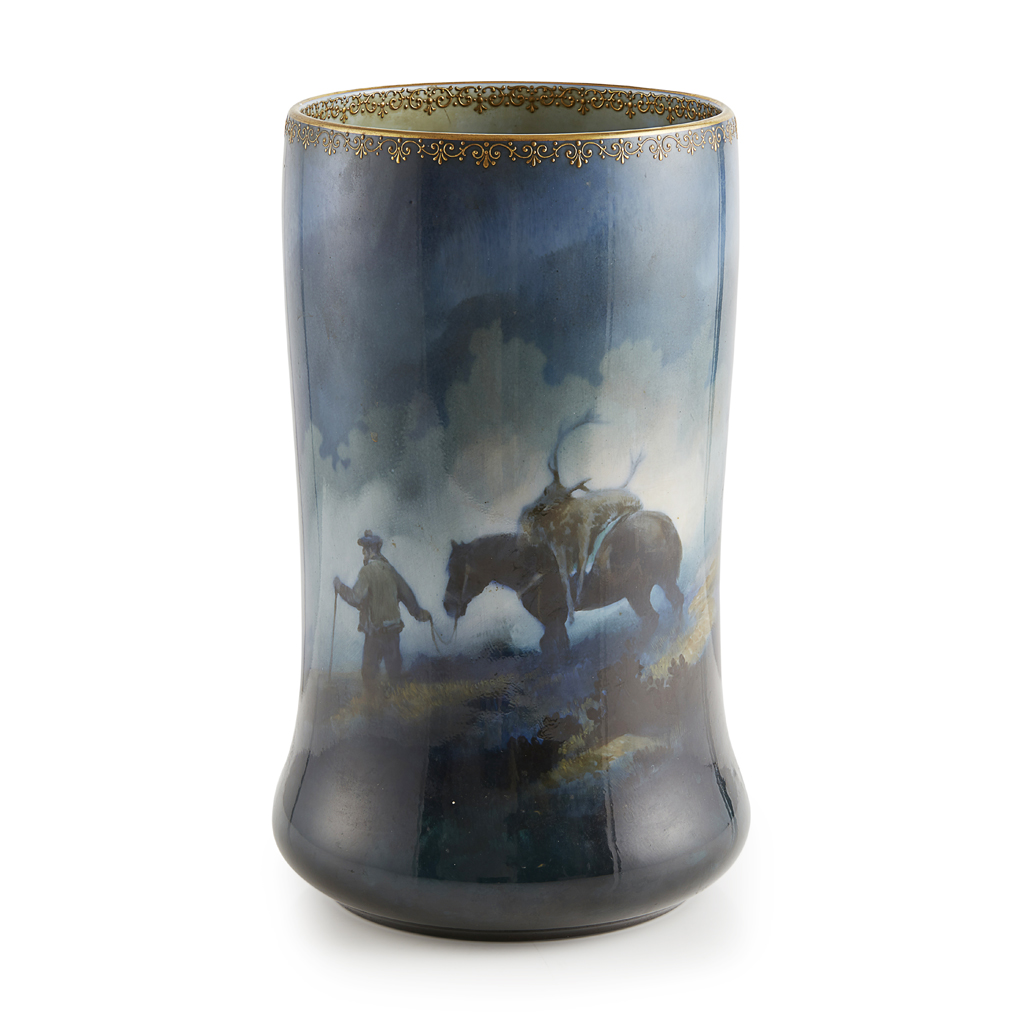 painted with a Highland deerstalking scene, gilded decoration to the rim, signed to the body TITTENSOR, printed maker's marks to base