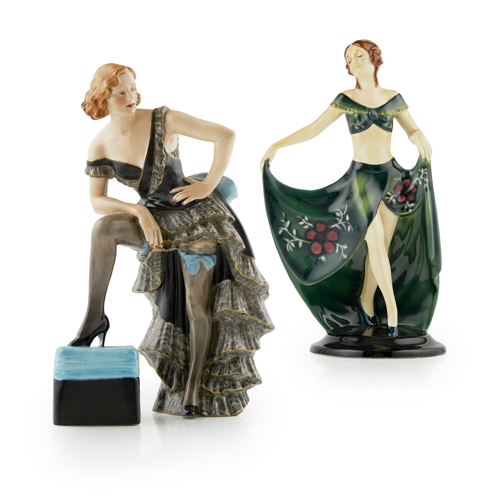 modelled as a showgirl, printed and painted marks to base SPECIALLY PRODUCED BY ROYAL CROWN DERBY, 26cm high; and an ART DECO GOLDSCHEIDER STYLE CERAMIC FIGURE, moulded mark to base 765, 31.5cm high (2)