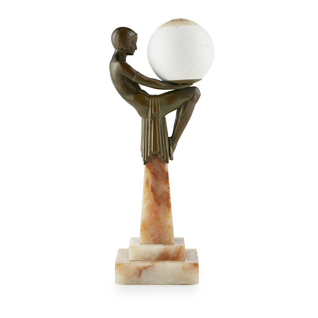 depicting a seated nude holding a patinated plaster globe shade, raised on a tapered onyx column and stepped base, wired for electricity