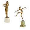 cast as a dancing girl and raised on a turned onyx base, signed in the bronze LORENZL, 22.5cm high; and another ART DECO FIGURE, patinated spelter, cast as a standing figure, raised on a turned alabaster base, 26cm high (2)