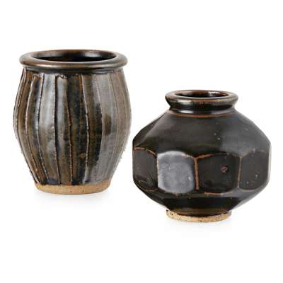 with vertical fluted decoration, 12.5cm high and a BERNARD LEACH ST IVES FACETTED VASE, 11cm high, both covered with tenmoku glazes and with impressed St. Ives and artist's seal mark (2)