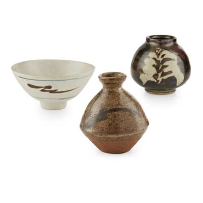 wax resist decoration under iron slip, incised artist's mark, 6.5cm high; a DAVID LEACH PORCELAIN BOWL, iron and cobalt brush decoration under a clear matt glaze, 11cm diameter; and a WILLIAM MARSHALL ST. IVES STONEWARE BOTTLE VASE, impressed seal mark, incised artist's mark, 8cm high (3)