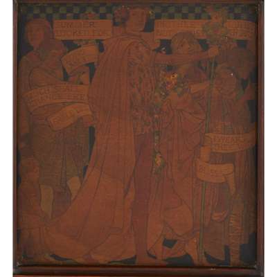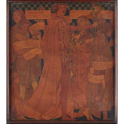 the ogee lid above chequer inlaid sides, each set with penwork panels painted in the Pre-Raphaelite manner and illustrating the poems of William Morris, 'Summer'; 'Autumn'; 'Winter'; and 'Spring' and 'Night' and 'Day', the whole raised on a stepped base with bun feet