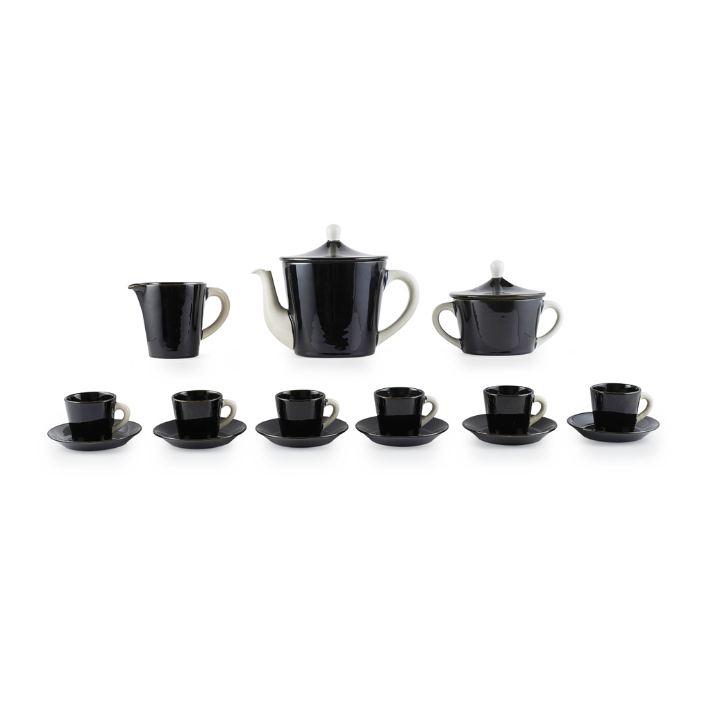 black and white glaze, comprising a Coffee Pot and Cover, 18cm high; Milk Jug; Sugar Basin and Cover; and six Cups and Saucers, printed maker's marks, 18-12-35/ 5030 (15)