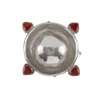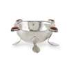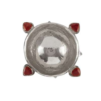 the hand-beaten bowl set with four red enamel stylised heart motifs, on four pointed oval supports, maker's marks LD