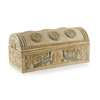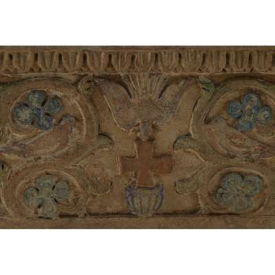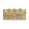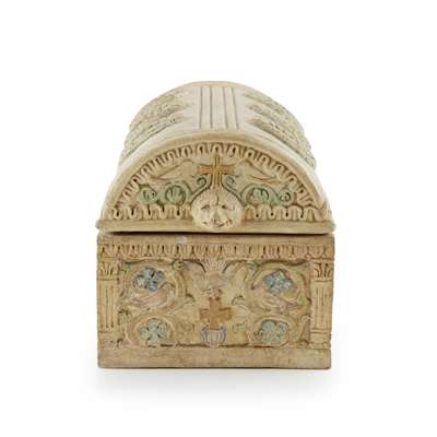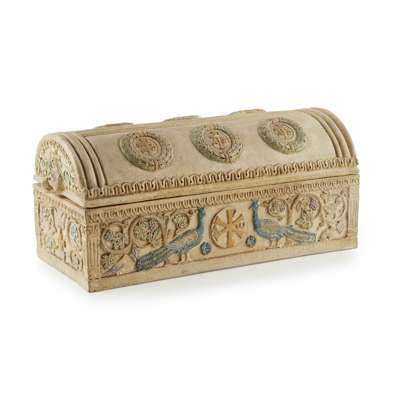 Note: Mary Watts took her inspiration for this casket from a drawing in Brindley & Weatherley's 'Ancient Sepulchral Monuments' of 1887. The design is based on the Sarcophagus of Archbishop Theodorus in the Church of Saint Apollinare in Classe, Ravenna. A smaller version of this casket is held at the Watts Galley, Compton.
