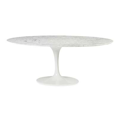 aluminium and fibreglass with upholstered cushions, each bears maker's label, 47cm wide, 80cm high, 45cm deep; and an associated TULIP TABLE, with oval marble top on tapering base, 200cm long, 73cm high, 122cm deep (6)