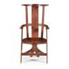 the curved top rail above broad splat back and solid seat with curved open arms raised on plank supports linked by stretchers