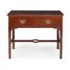 the rectangular top with dentil frieze above two drawers, each with decorative brass handles, raised on square legs and linked by a pierced stretcher
