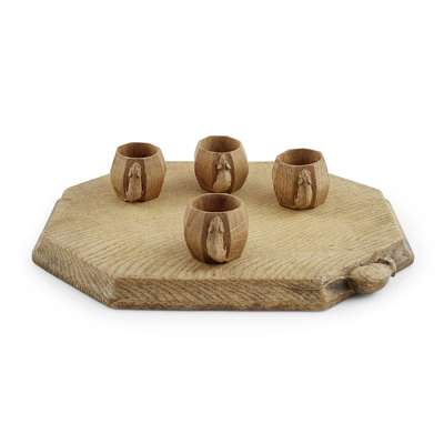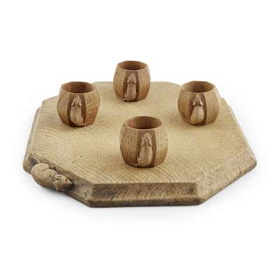 of octagonal form, with carved mouse signature, 30.5cm across; together with a SET OF FOUR OAK NAPKIN RINGS, all with carved mouse signature, 3cm diameter (5)