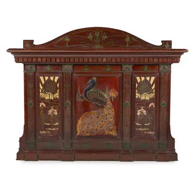 the projecting cornice above three panels, painted with a peacock in a garden setting