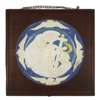 or circular form, depicting the Madonna and Child with the cross, within a band of four angels in relief, with inscribed maker's marks verso, within a square stained oak frame (crack to left side)