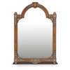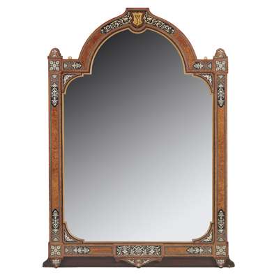 the arched mirror plate in a frame inlaid with panels of foliate scrolls and outlined with ivory stringing, the cresting centred with an inlaid monogrammed cartouche MJW