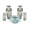 of baluster form, decorated with reserves of birds and foliage within a frieze of flowers on a pink ground, 42.5cm high; a PAIR OF CYLINDRICAL VASES, of similar decoration on a blue ground, 23.5cm high; and a JARDINIÈRE, of flattened ovoid form with floral decoration, base drilled, 22cm diameter, variously marked, damages (5)
