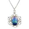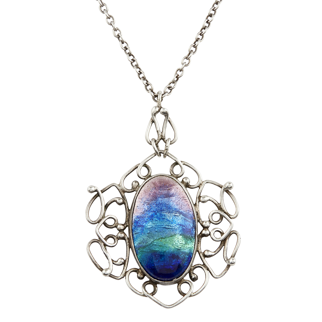 the central oval panel with blue, green and purple enamel detail, in a scrolling wirework border, to a plain belcher link chain, unmarked