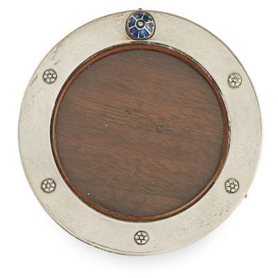 of circular form, with applied rosettes and a single enamel roundel, with original oak back, stamped maker's marks L&Co/ 5550, hallmarked Birmingham 1911