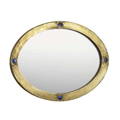 of oval outline, the hammered surface inset with four enamelled panels and brass bosses