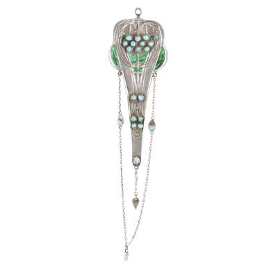 Note: This pendant in its form and execution demonstrates awareness of the symbolist jewellery being produced in Glasgow at the end of the 19th century and early 20th century, especially by Francis and Margaret Macdonald. The known work of the sisters is mainly figurative rather than in this example which shows opposed birds, a motif more commonly associated with artists such as Talwin Morris.